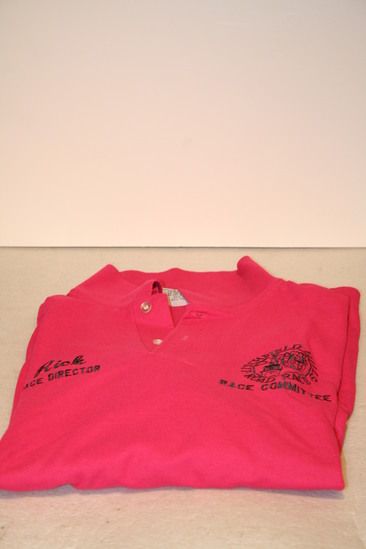 Pink short sleeved polo shirt with two buttons. Logo on front, upper left hand side of shirt, embroidered in black. Circle with "Litchfield Hills Road Race" embroidered around outer edge. Runners and a steeple or clock tower inside. "Race Committee" embroidered underneath logo. "Rick/ Race Director" embroidered in black on upper right hand side of shirt.