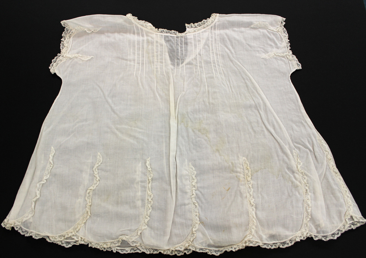 White cotton child's dress; kimono style; vertical pleats at top in front and back; lace trim at neck, sleeve cuffs and hem; center back opening with no closures