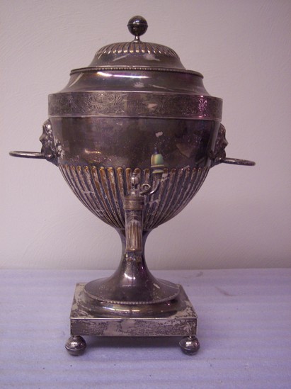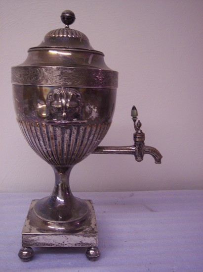 Square base with four ball feet; oval stand surmounted by an oval urn with gadrooning half way up the body and a band of foliated engraving at top. The high top is also partly gadrooned and has a ball finial, which turns and lifts up to allow steam to come out of perforated holes. A long molded spigot emerges from front of urn with a fancy handle topped by a green ivory acron. On each side is a heavy cast lion's head with a pendant ring in its mouth. Inside is an oval silvered plate fitted into opening with a hole in center under which is a metal tube soldered to plate for holding a length of cast iron, which was heated and inserted into tube to keep contents hot. It has two loops each side of hole to hold inserted plate. There is an oval in front in the engraved decorative hand on which is engraved the initials "BMT" for Benjamin and Maria Tallmadge. This was probably given to Colonel Tallmadge and his second wife, Maria Hallett, when they married May 3, 1808