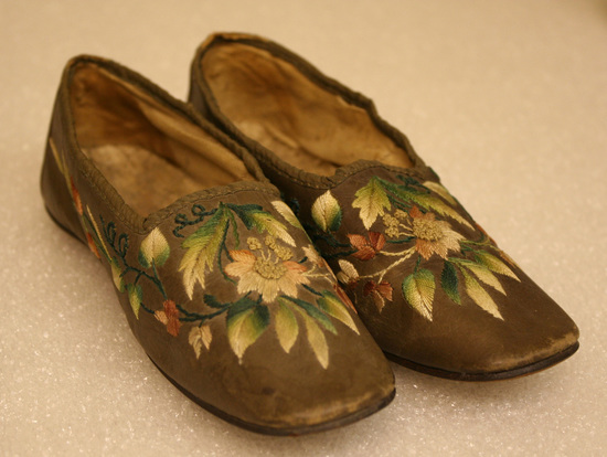 Pair of brown leather child's shoes; orange, green and tan silk embroidered floral design; square toes; tan cotton twill lining; tan leather soles; brown silk ribbon sewn around edge of opening