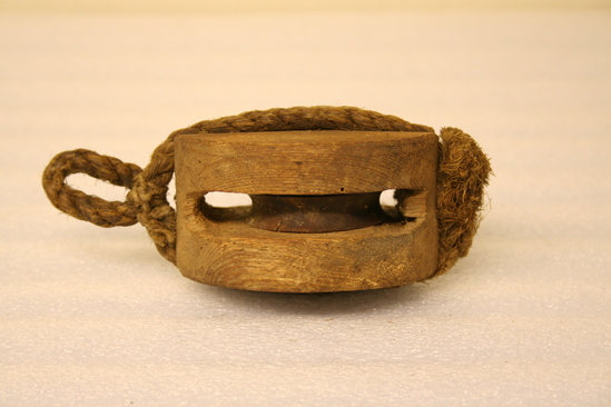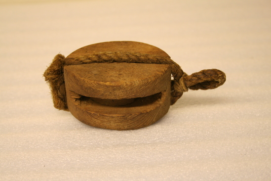 Wooden pulley in oval shape with 1 3/4" diameter grooved wheel inside