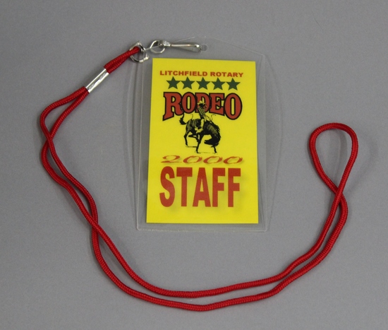 Staff pass for Litchfield Rotary Club's 2000 Rodeo. Laminated pass on red lanyard. Text "Litchfield Rotary/Rodeo/2000/Staff." Yellow pass with red lettering and image of bronc riding.