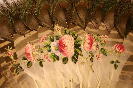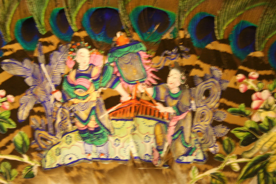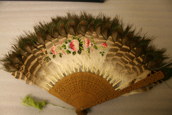 Fan with wooden stretchers with pierced design, each stretcher holds a peacock feather at top. Asian scene painted across body of feathers on front. Two woemn in kimonos, flowers and leaves on either side. Stretchers pinned at bottom with brass and mother of pearl pin. Green silk tassel attached to pin.