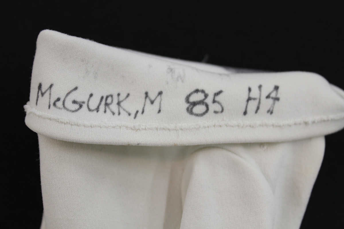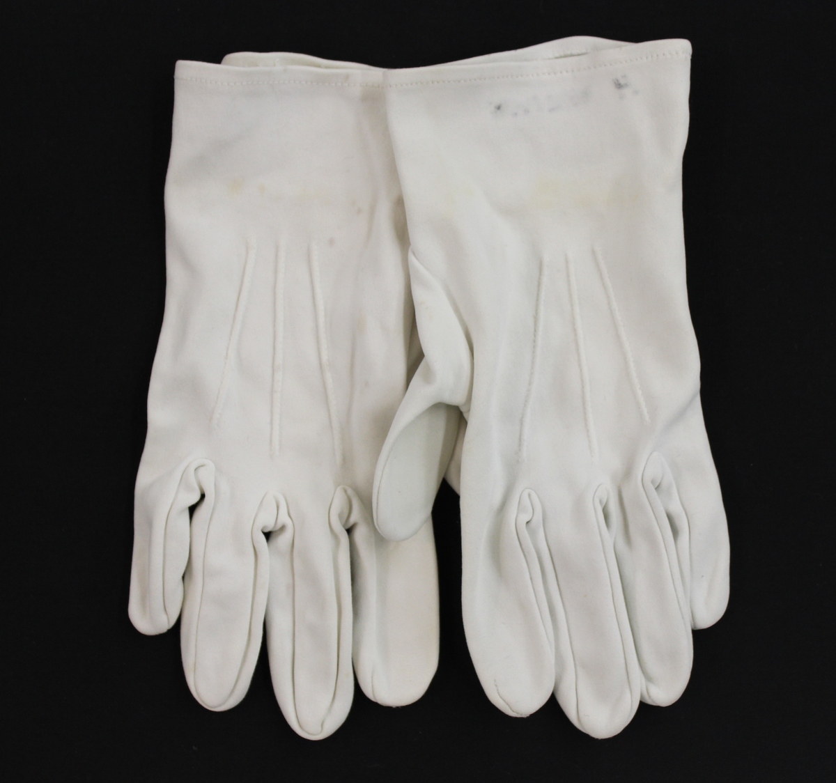 Pair of white cotton dress gloves issued as part of cadet uniform at West Point. Wrist-length, with three decorative points on the back and a herringbone stitch on the front, near the wrist, which attaches a strip of elastic to the inside. Both gloves marked, "McGURK, M/85/H4" in marker on the inside wrist.