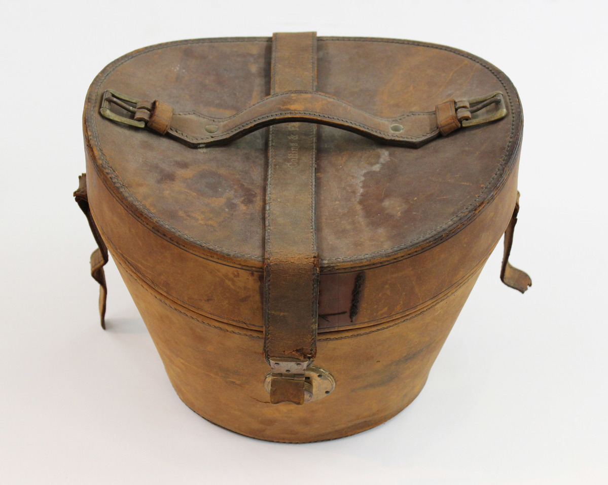Leather hat box lined with red silk. Downward curving top and leather handle with brass buckles at either end. Two leather straps on either side of the hat box fasten in the buckles. Central leather strap running from lid to front of box, with brass fastener at the end; attaches to lock on front of box, just above key hole. Two interior straps, also with buckles. Side of box reads "C.S.H", and central strap has embossed lettering "Collins & Fairbanks."