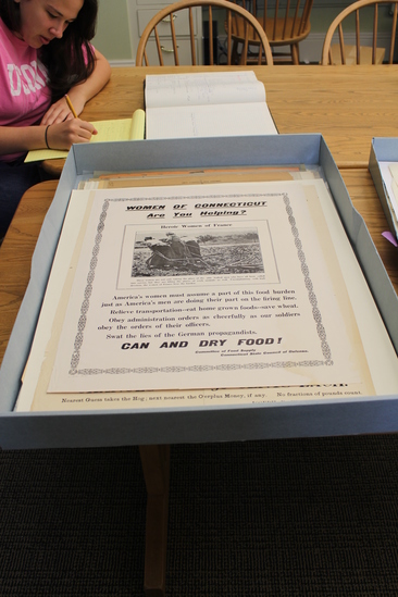 World War I era poster. White poster with black wreath border. Black and white photo of three women pulling harrow in center. Poster printed with, "WOMEN OF CONNECTICUT/ ARE YOU HELPING?/ These women are not only taking the place of the able bodied men who have all been called/ into service, but they are filling the places of work animals as well. Uncomplaining, with high/ devotion, the women of France bear the burden./ America's women must assume a a part of this food burden/ just as America's men are doing their part on the firing line./ Relieve transportation --- eat home grown foods-save wheat./ Obey administration orders as cheerfully as our soldiers/ obey administration orders of their offices./ Swat the lies of the German propagandists. CAN AND DRY FOODS/ Committee of food Supply/ Connecticut State Council of Defense."