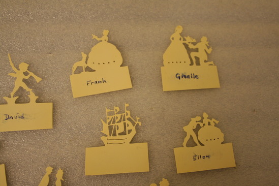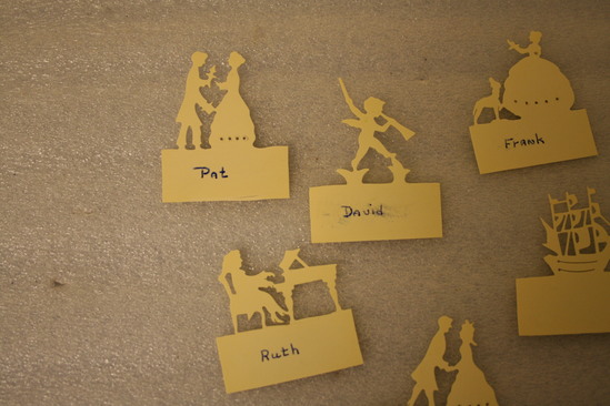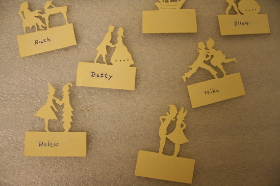 Cream colored place cards with holders - each one is a cut out silhouette of figure or figures interacting together. Bottom of each is rectangle where names have been written in blue ink. Small black rectangular stand with thin line cut into middle where base of card inserted to stand upright.