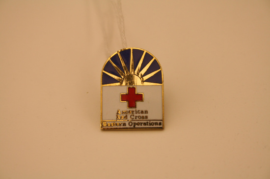 American Red Cross pin, rectangular shape with the top rounded. Top half of pin blue with gold sun rising - rays of sun touching edge of pin. Bottom half of pin white. Red cross in center. Underneath cross printed in gold lettering "American Red Cross Eastern Operations" Back of pin gold in color.