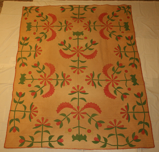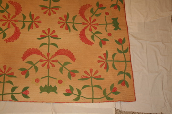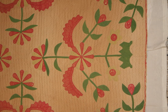 Appliqued quilt. Cactus rose design appliqued in red, yellow and green. Beige background. Floral designs are oversized starting at edges and pointing inwards towards center of quilt. 6 large designs, 7 small designs and 2 corner designs. Edges bound in red. Quilting follows designs with straight lines inbetween in repeating pattern.