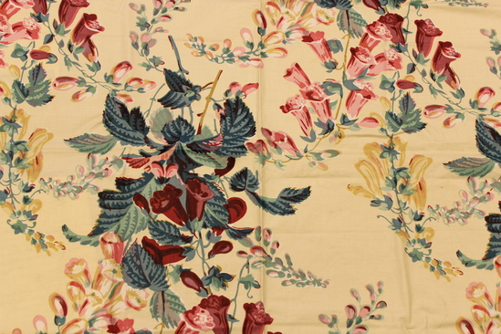 Rectangular cloth sample made from glazed cotton. Sample has an off-white background with pink and red foxglove print. Green leaves and tan stems surround the flowers. Lightweight cloth, smooth to the touch.
