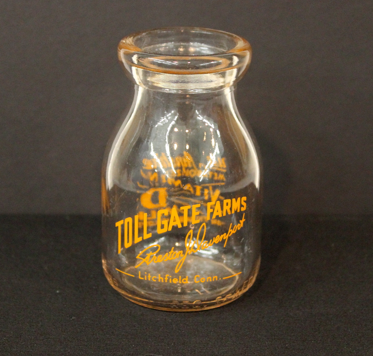 Glass milk bottle with round lip top, circular bottom, and tapered sides. Half pint. Printed lettering on the front in orange, "TOLL GATE FARMS/Preston J. Davenport/Litchfield Conn." Printed on back "Use Ayrshire/METABOLIZED/VITAMIN/D/MILK/'FOR THE BABY YOU LOVE'." Embossed lettering on front, bottom, "REG. SEALED MTC" and at back, bottom, "HALF PINT LIQUID 3766."
