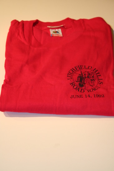 Pink short sleeved t-shirt. Logo printed in black on upper left hand side of shirt. Circle logo with runners and steeple or clock tower. "Litchfield Hills Road Race" printed around outer edge of logo.