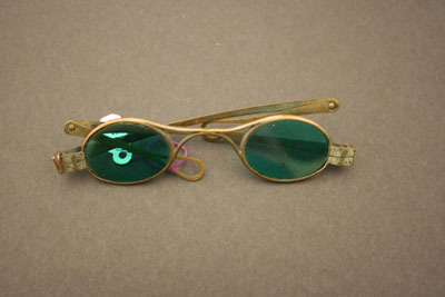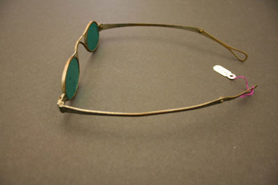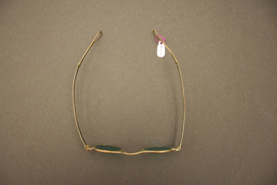 oval shaped lenses with green glass; extension bows. Bridge is K or X shaped.