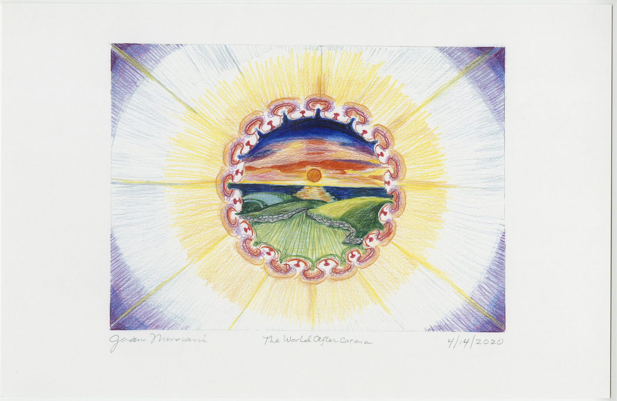Abstract design, similar in layout to a mandala. Center medallion surrounded by rings of yellow, purple, and blue with twelve yellow rays extending from medallion to edges of work. Medallion border is drawn to resemble COVID-19 particle. Within medallion is a landscape scene showing rolling hills in front of a body of water, with a sunrise above.