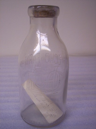 Large milk bottle. On one side impressed into glass is Echo Farms logo "E" "C" "H" "O" letters overlap each other. On other side "THE ECHO FARMS CO'S/BOTTLE/AND MUST BE RETURNED" Impressed along bottom "No one but owner allowed to use it" and "This Bottle is Registered" Cork in top of bottle