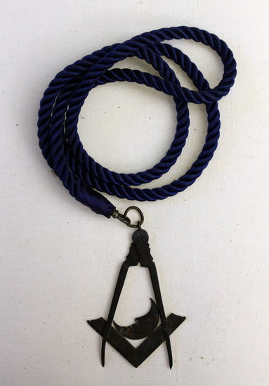 Dark blue braided rope with satin ribbon twist at end. Metal loop at end of rope attached to a metal emblem. Stamped decoration emblem depicting an open compass with a corner ruler and quarter moon between the open arms of the compass.