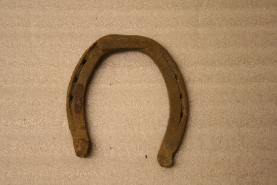 Iron horse shoe. Four square shaped holes on either side. Worn at top. Metal has bent and stretched