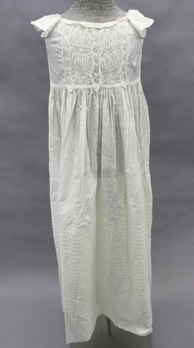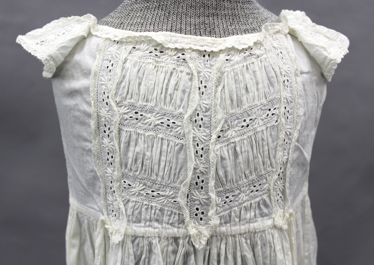 White cotton christening dress; square neck with drawstring at front; cap sleeves with white work embroidery; V front panel with white work embroidery edged with lace; ties with lace ends; drawstring waist at back; skirt with tucks at hem