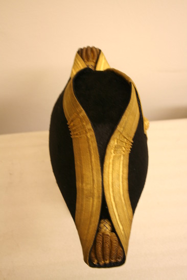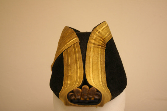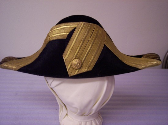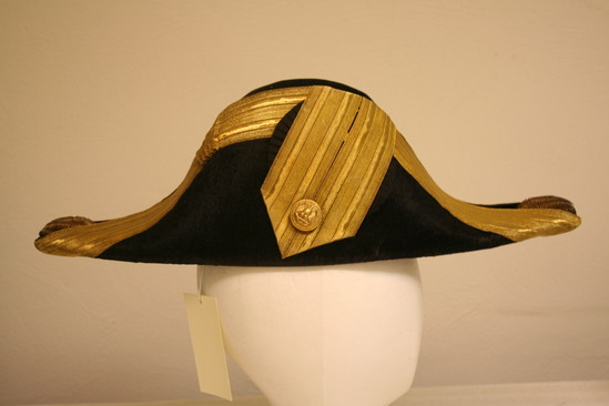 Black beaver skin cocked hat; protruding in front and back; fold down center of hat trimmed in gold ribbon; ribbon ruffled near crown; tip of protrusion decorated with gol and blue coils and spheres; on right side, two gold ribbons side by side cam over the fold and down the side of the hat ending in a point with a button decorated with an eagle near bottom; light brown band and white silk lining inside; label "The Mark of Merit/Meyer New York/Government Standard"