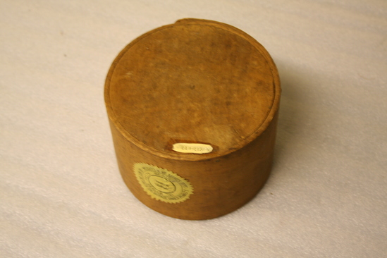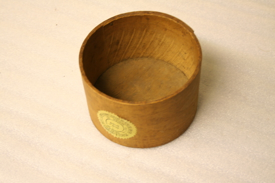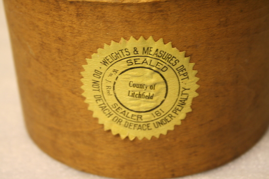Round wooden container. Sides lapped over each other and held in place with metal tacks. Stick on side of container - placed upside down from open end. Round with pointed ends. "Weights and Measures Dept/Do Not Detach or Deface Under Penalty" printed on outside edge. "County of Litchfield" in center. Around that "Sealed/Wm. J. Reed/Sealer 161"