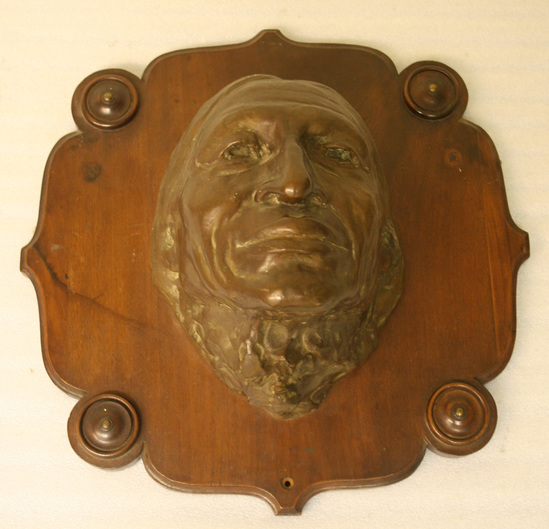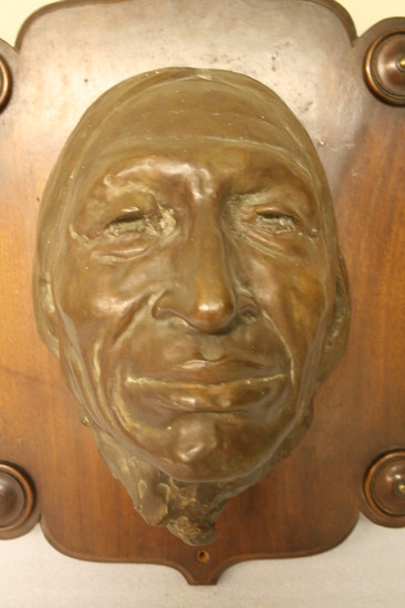Bronze life mask sculptuer of Iron Tail, a Native American man used as the model for the U.S. 5 cent piece. Sculpture is mounted on a wooden board.