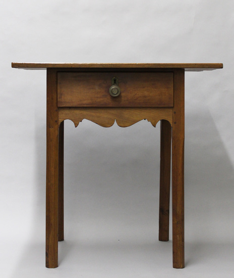 Side table - thick round legs with wood planed away in stylized pieces. Carved skirt on all four sides - roughly executed. Drawer on one side with brass key hole and round brass pull (probably later addition) Top of table overhangs base on all four sides. Three boards of wood joined together to create top.