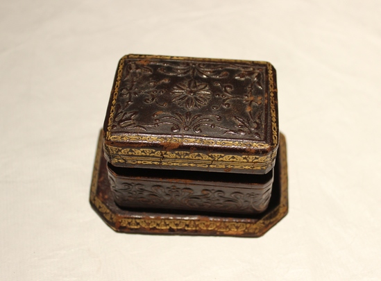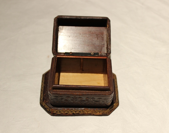 Small wooden box with embossed leather decoration. Floral motifs on all sides, with borders of gold floral motifs along edges. 2.75" x 2" x 2" box on 3.75" x 2.75" x 0.25" base. Interior of dark stained wood with lighter wood bottom and metal hinge. Stamped "Made in Italy" on bottom with sticker reading "B. Altman & Co./New York/467/174/1/175."