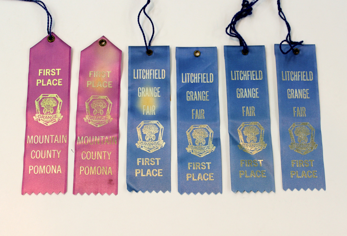 2017-37-2: Pink satin ribbon with gold printing: "FIRST/PLACE/MOUNTAIN/COUNTY/POMONA" with Grange logo. Purple cord threaded through metal eyelet at top. Paper tag on back with printed lettering, "NAME/CLASS/EVENT/AWARD/DATE." Handwritten in name, "Julie Snowman." 2017-37-3: Pink satin ribbon with gold printing: "FIRST/PLACE/MOUNTAIN/COUNTY/POMONA" with Grange logo. Metal eyelet at top. 2017-37-4: Blue satin ribbon with silver printing, "LITCHFIELD/GRANGE/FAIR/FIRST/PLACE" with Grange logo. Metal eyelet at top. Royal blue cord threaded through eyelet. Paper tag on back with printed lettering, "NAME/CLASS/EVENT/AWARD/DATE" and "HODGE BADGE CO., INC./1-800-556-2440." 2017-37-5: Blue satin ribbon with silver printing, "LITCHFIELD/GRANGE/FAIR/FIRST/PLACE" with Grange logo. Metal eyelet at top. Royal blue cord threaded through eyelet. Paper tag on back with printed lettering, "NAME/CLASS/EVENT/AWARD/DATE" and "HODGE BADGE CO., INC./1-800-556-2440." 2017-37-6: Blue satin ribbon with silver printing, "LITCHFIELD/GRANGE/FAIR/FIRST/PLACE" with Grange logo. Metal eyelet at top. Paper tag on back with printed lettering, "NAME/CLASS/EVENT/AWARD/DATE" and "HODGE BADGE CO., INC./1-800-556-2440." 2017-37-7: Blue satin ribbon with silver printing, "LITCHFIELD/GRANGE/FAIR/FIRST/PLACE" with Grange logo. Metal eyelet at top. Royal blue cord threaded through eyelet. Paper tag on back with printed lettering, "NAME/CLASS/EVENT/AWARD/DATE" and "HODGE BADGE CO., INC./1-800-556-2440." 2017-37-8: Blue satin ribbon with gold printing, "NATIONAL GRANGE/1989 NEEDLEWORK CONTEST/EMBROIDERY-CRAFT GROUP/STATE AWARD-FIRST PRIZE/EMBROIDERY." Rosette at top, plastic button with gold background and black printing, "COATS & CLARK'S/Quality Threads" with company logo. Backed with cardboard and foil disk. Gold, cotton string loop hanger. Paper sticker attached with handwritten lettering, "Julie Snowman/Litchfield." 2017-37-9: Blue satin ribbon with gold printing, "NATIONAL GRANGE/1989 NEEDLEWORK CONTEST/EMBROIDERY-CRAFT GROUP/STATE AWARD-FIRST PRIZE/EMBROIDERY." Rosette at top, plastic button with white background and blue printing, "COATS & CLARK/CRAFTS & YARNS/DIVISION" with company logo. Backed with cardboard and foil disk. Yellow, cotton string loop hanger. Paper sticker attached with handwritten lettering, "CLASS G - 1ST/JULIE SNOWMAN POMONA #4." 2017-37-10: Yellow satin ribbon with blue printed lettering, "JUDGED/IN/NATIONAL/COMPETITION" with Grange logo at top. Tan paper stapled at bottom. Metal eyelet at top with yellow cotton string threaded through eyelet. Paper tag on back with printing, "made by/FAIR Publishing House/Norwalk, O. 44857/DATE/CLASS/WON BY."