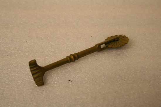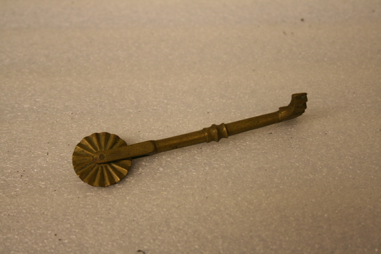 One end with crimped wheel between two posts at end of shaft with three ring turnings in center, the other end flares to half moon with triangular crimped end. From Phelps House