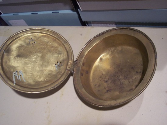 Spun brass pan with tapered sides, flat rim with rolled and incised edge, hinged top with round end tab on socket, copper rivets. Ring end to socket. Top has same rim as pan, and flat domed top with three sets of holes in circles with one in center of each. Geometric engraving with triangular base. Turned wooden handle.