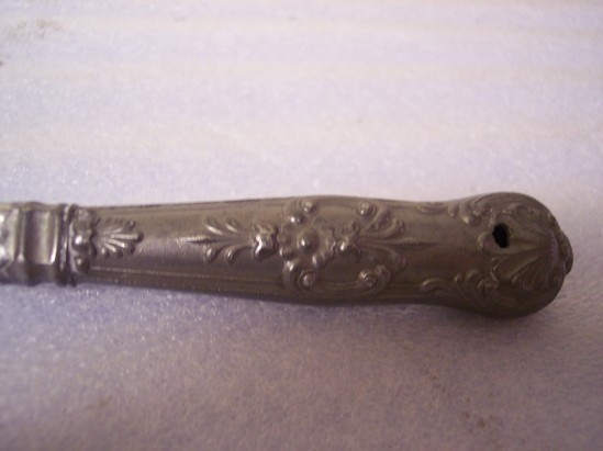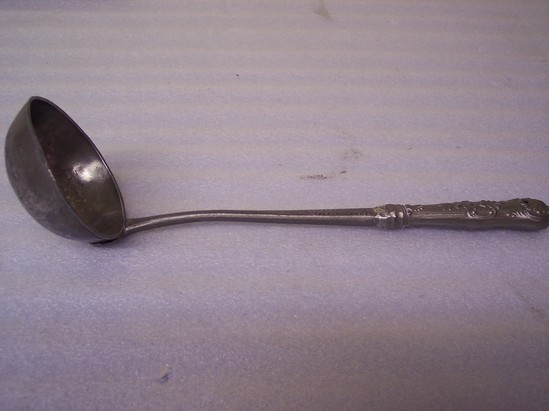 Bowl with reeded lip, handle joint rayed. Fancy hollow cant handle with solder mend 2/3 up. Handle pierced for hanging.