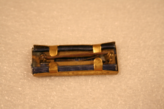 Rectangular bar pin covered in blue grosgrain ribbon with gold metal edge around bar. Gold branch protruding from center of bar 1 3/8" x 1/2". Issued as Presidential Unit Citation during WWII; the oak leaf ribbon device indicates this was the unit's second such award during service.