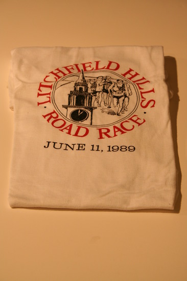 White short sleeved t-shirt. Logo on front center of shirt, printed in red and black. Circle logo with runners and steeple or clock tower. "Litchfield Hills Road Race" printed around outer edge of logo. "June 11, 1989" printed below logo.