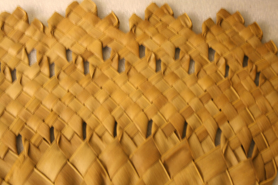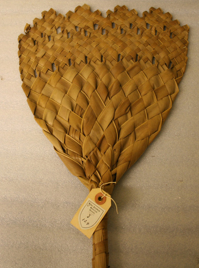 Flat fan made of woven grasses. Grass blades are wide and flat. Basketweave design. Round handle at bottom.