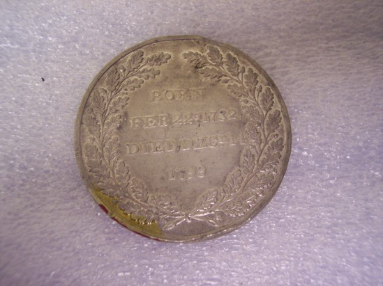 Round medal with left facing portrait bust of George Washington on one side. Arched around bust "Gen. George Washington" Other side of coin has border of oak leaves with inscription in center "Born/Feb 22nd 1732/Died Dec. 14/1799"