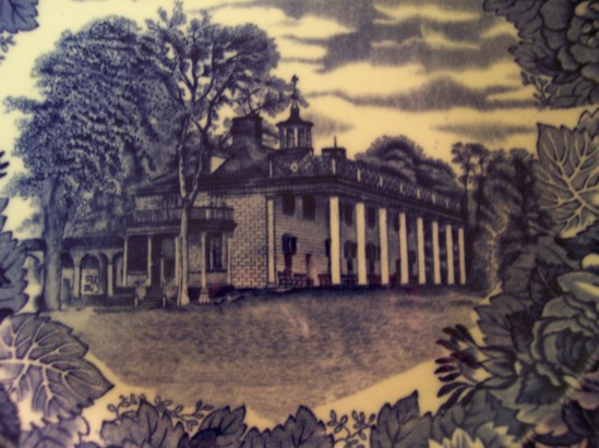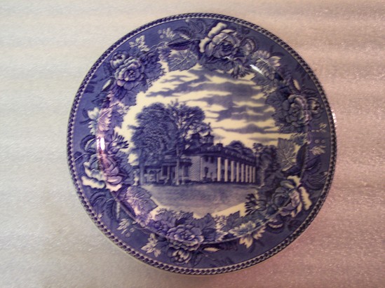 Blue and white plate with floral border. Central image is of Mount Vernon. Back of plate reads "1744-1892, Mount Vernon, The Home of Washington" and that it is Wedgwood imported from England.
