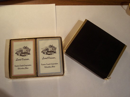 Two decks of cards. Both still wrapped in original cellophane. One deck has gold border with red line and other deck has silver border with blue line. Fronts of both packs have picture of recreational vehicle with palm trees in background. Underneath picture "Land Cruiser/Custom Coach Corporation/Columbus, Ohio" printed in black lettering. Decks housed in cardboard box covered in gold paper. Exterior lid slides over top of box. Black velvet exterior with gold paper border.