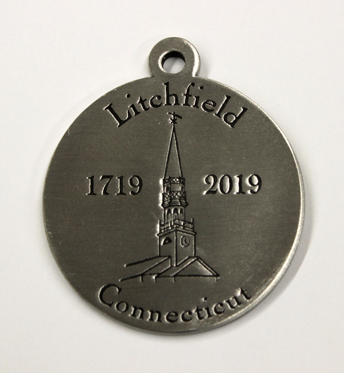 Circular pewter ornament with identical decoration on either side. Features engraved image of the First Congregational Church steeple with text, "Litchfield/1719/2019/Connecticut" (300th Anniversary logo). Small pewter loop at the top for hanging.