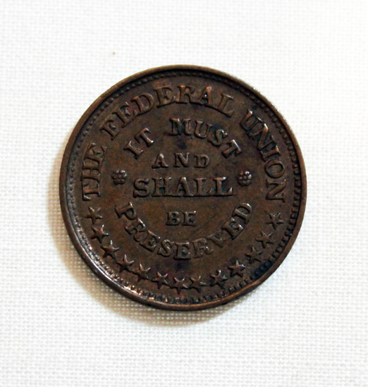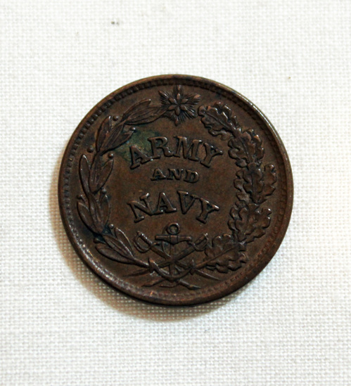 Round copper token. One side stamped with leaf decoration, anchor with crossed swords at bottom, and "ARMY/ AND/ NAVY" stamped in center. Reverse side stamped with stars along bottom and "THE FEDERAL UNION/ IT MUSE/ AND/ SHALL/ BE/ PRESERVED" stamped in center.