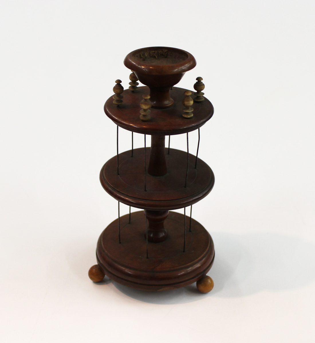 Three tiered wooden spool stand with three ball feet; five metal rods that transverse all levels of stand; rods hold spools in place