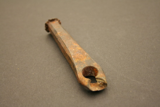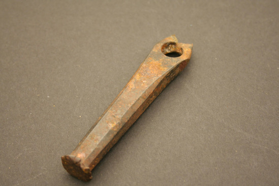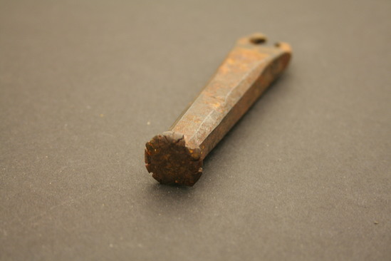 Hole punch - used on leather; top has head like a nail but misshapen and bent from repeated hammering; octagonal shaped rod extends down; thick body; large hole cut into bottom where rod widens slightly; tip of punch broken off - unsure what shape was; stamped on punch "J.E. Wood-----" and "AST. STEEL" with anchor in center"
