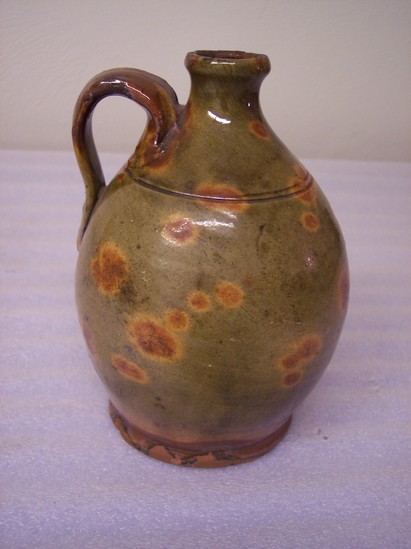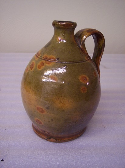 OLIVE GREEN GLAZE WITH YELLOW-BROWN WPOTS. SHAPED RIM AND BASE, EAR-SHAPED HANDLE. INCISED LINES AROUND TOP.