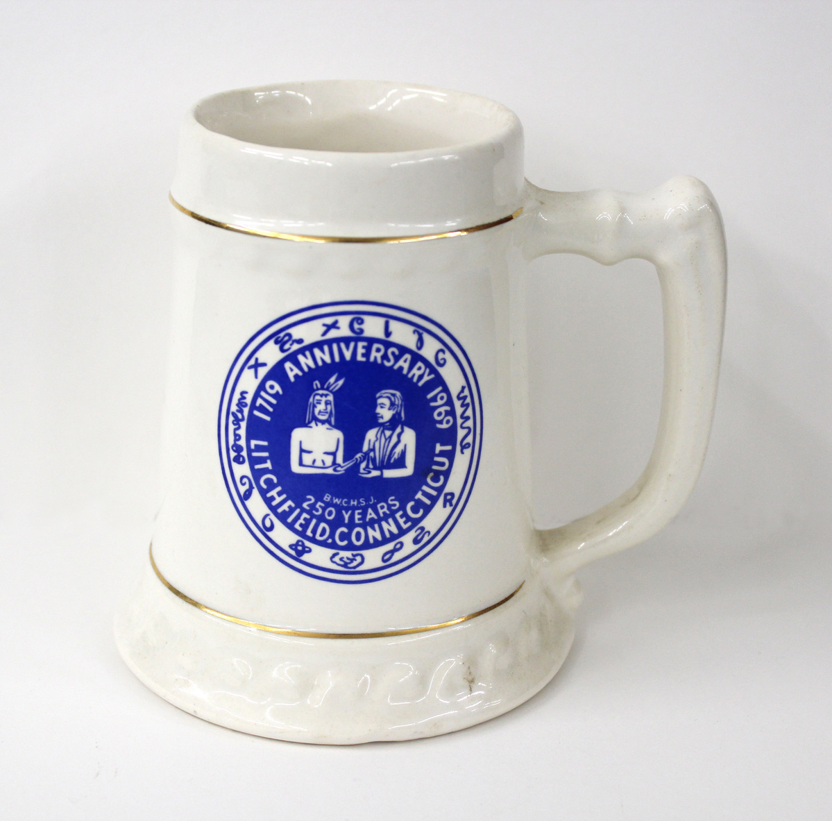 White ceramic mug in a tankard style. Large, single-curve handle with straight top. Mug has a narrow opening and widens towards base, with a recessed bottom. Narrow band of gold just below opening and above base, each with a band of repeated, raised tear-drop shapes below. At center on one side, in blue, is the logo for the town of Litchfield's 250th Anniversary celebration, showing a Native American and a colonist set in two rings of text, "1719 ANNIVERSARY 1969/LITCHFIELD, CONNECTICUT/250 YEARS" in the first, with the second containing the marks of the fourteen Native representatives and two colonial negotiators who signed the 1715 deed granting land to Litchfield's settlers. On bottom, embossed manufacturer's mark showing a mug within a rectangular border with letters "USA" above.