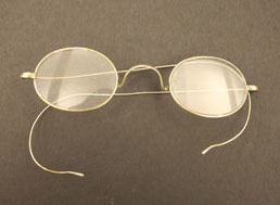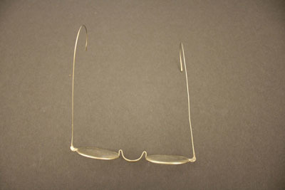 Oval lenses, wire bows with shaped ends to fit over ears. Frames are made of luminium an alloy of aluminum. Case is hard cardboard