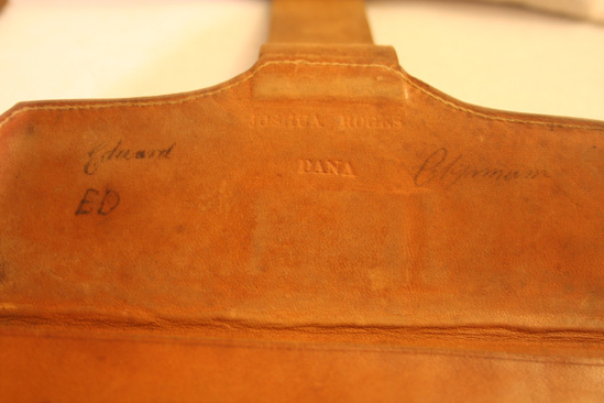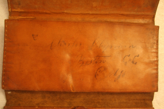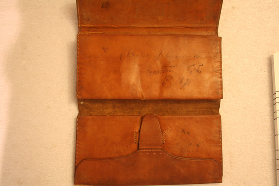 Brown leather tri-fold wallet. Top pocket is accordian style with additional pocket inside. Bottom pocket has accordian style pocket on top with additional pocket inside. Flap to close bottom accordian pocket. Outside of wallet decorated with tooled design of two diagonal lines. Leather strap to close. Below top flap inked writing "Edward Clymann" "ED" and impressed stamp "Joshua Rogers/Dana" Written on upper pocket in ink "Charles Chipman/Boston C x C/Mass"