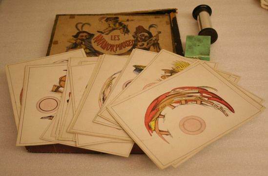 Les Anamorphosis Game in cardboard box. Box contains 24 cards each with distorted picture around a 1 1/2" circle. There is a cylinder with a mirror which is placed on the circle in the card. Looking in the mirror, the pictures become undistorted and identifiable. The images related to Emperor Napoleon III who ruled from 1852-1870.