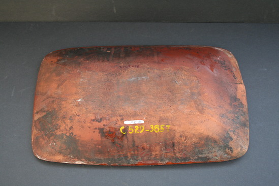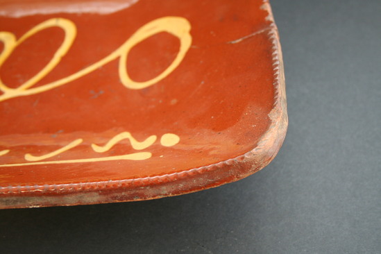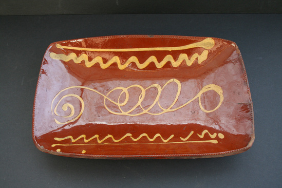 Rectangular dish with scroll decoration on face of piece, notched edge and slip ware glaze