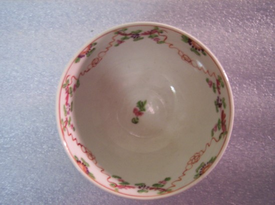Tea bowl is decorated with garlands of flowers in polychrome and is overglazed. No handles. Has single, small flower at the base on the interior.