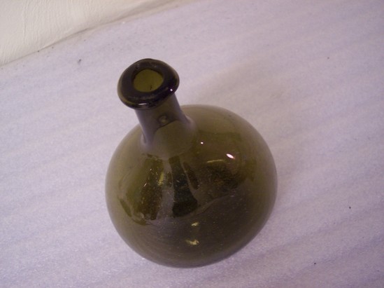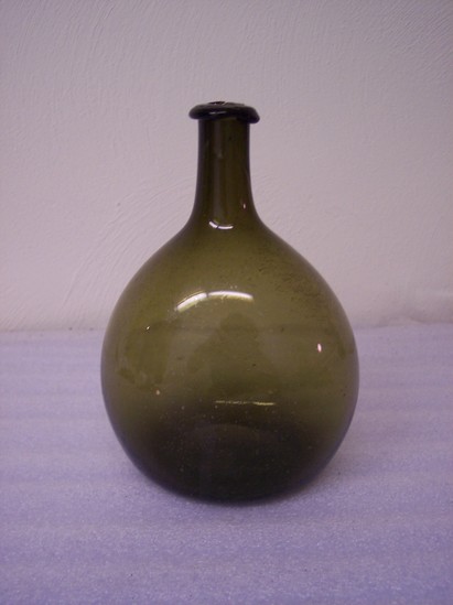 Green glass bottle, body is round like a bubble with a short neck. Pontil mark on bottom