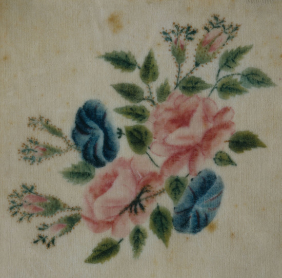 Roughly cut square of white velvet with watercolor of pink moss roses and blue morning glories. Flowers are both in bloom and bud form with green leaves behind them. Framed under glass -white mat board, simple black frame.